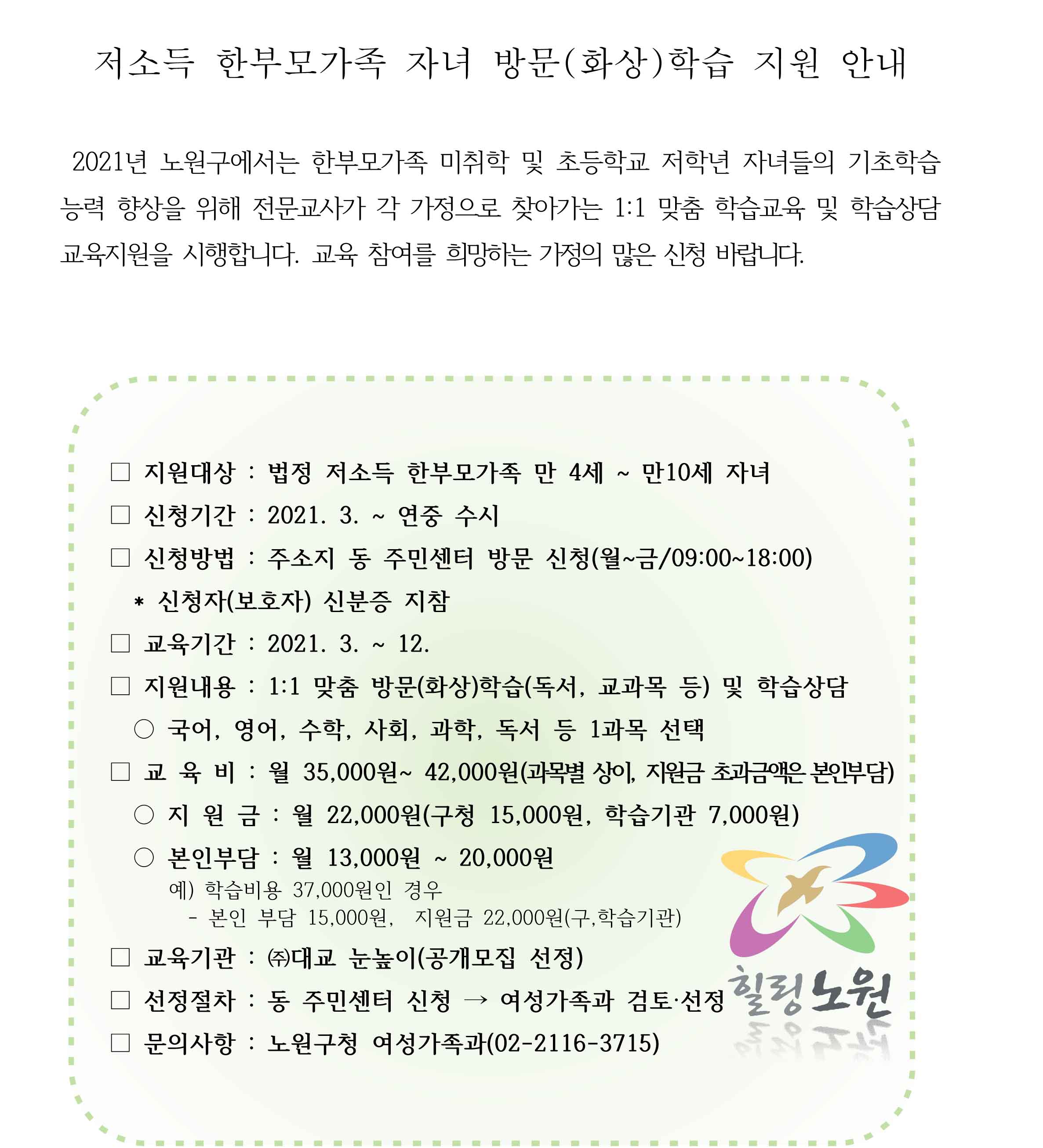 저소득 한부모가족 자녀 방문학습 지원 안내