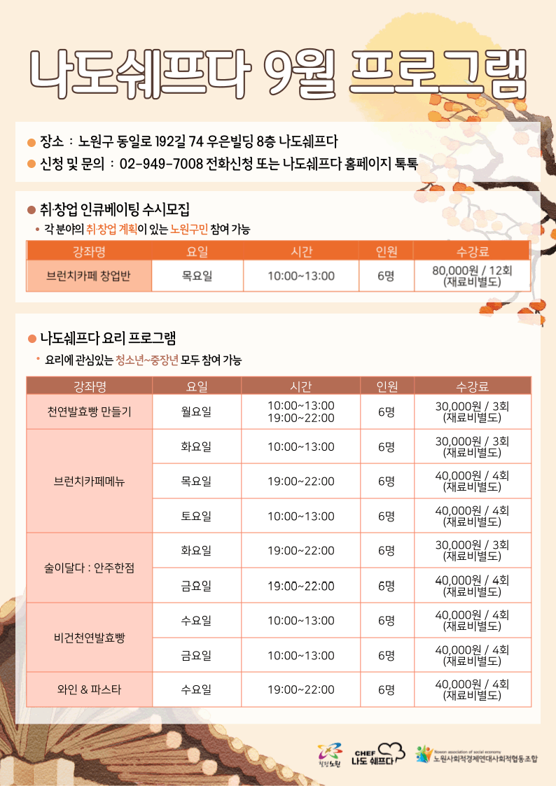 노원구 공유주방,나도 쉐프다 9월 프로그램