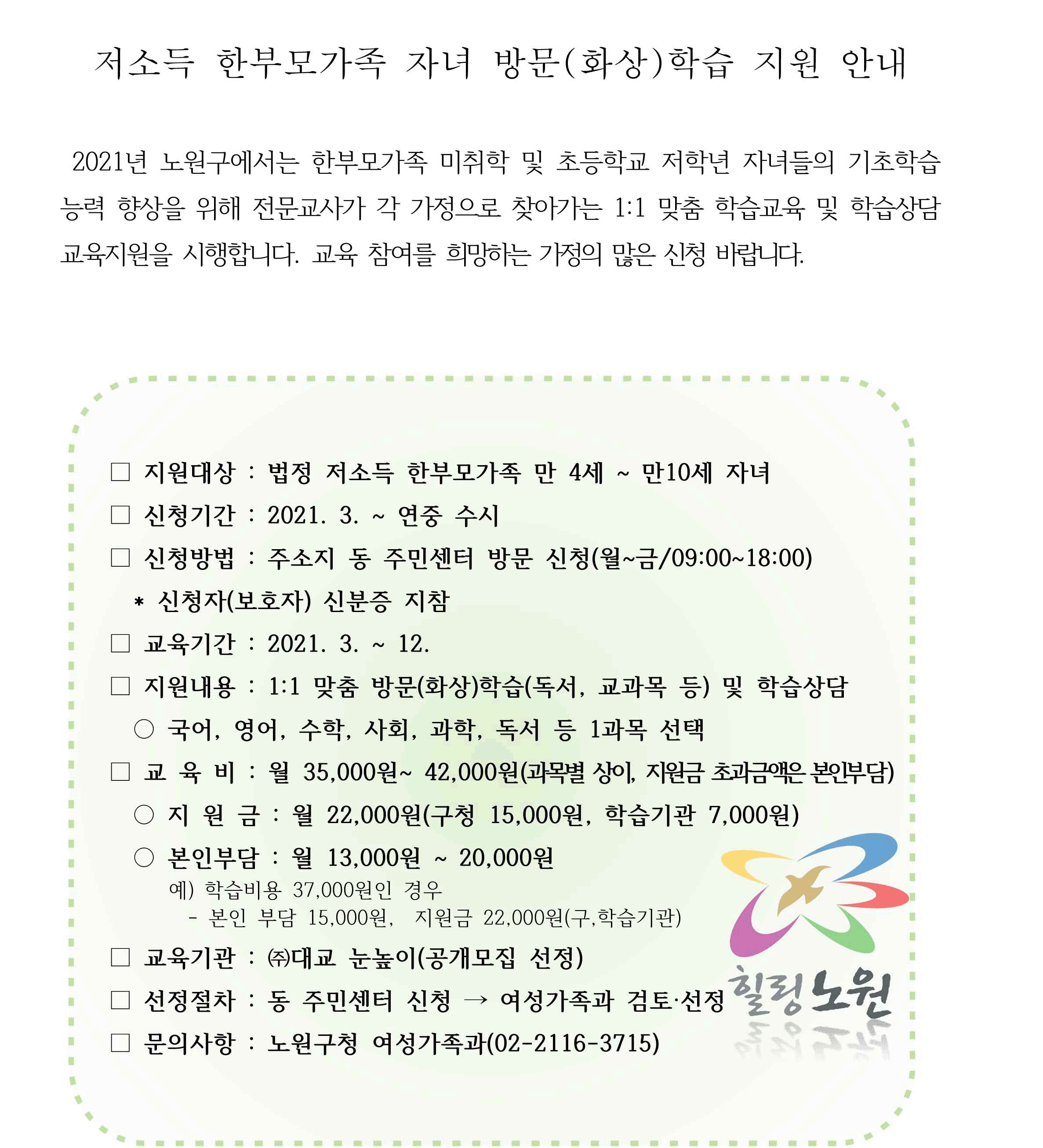 저소득 한부모가족 자녀 방문(화상)학습 지원